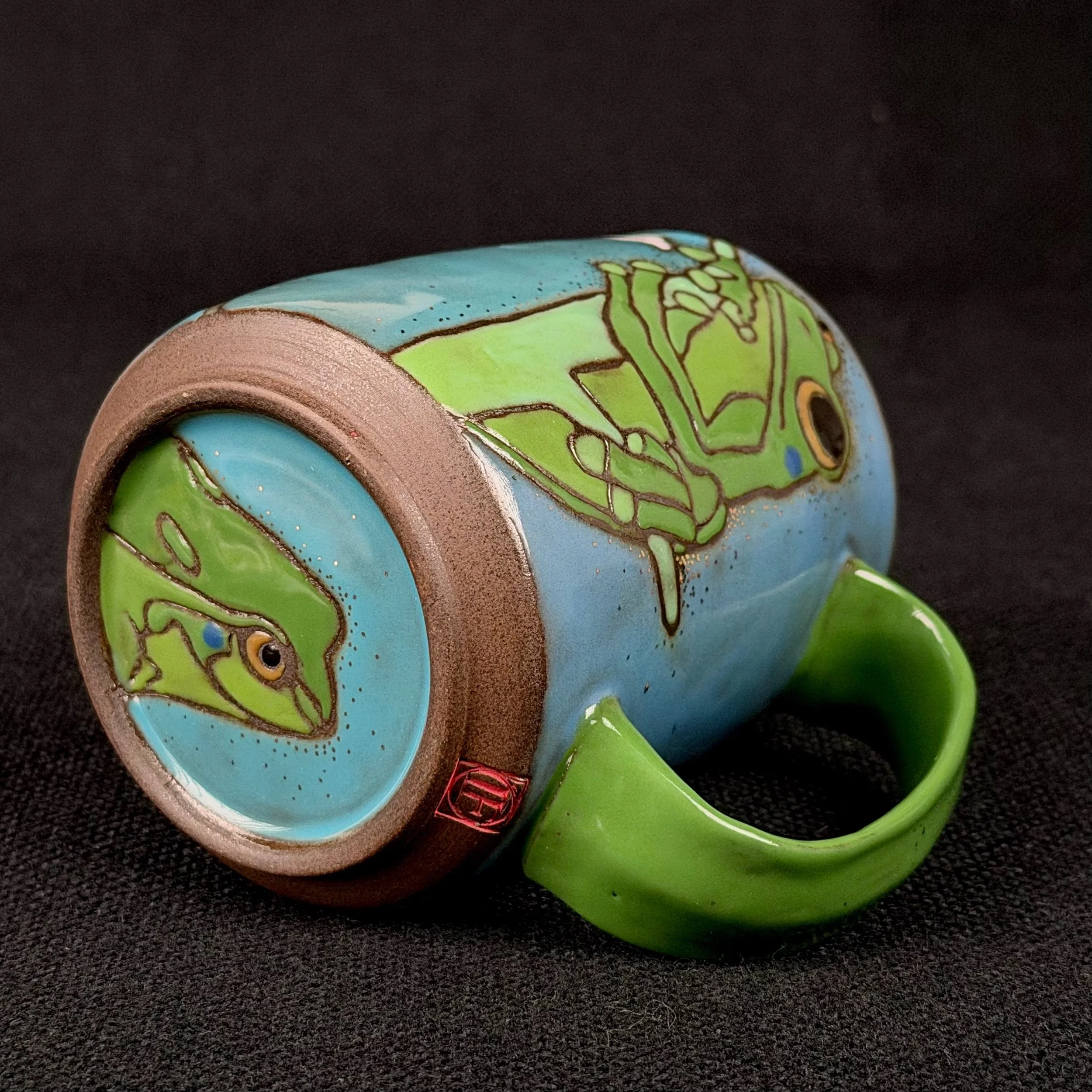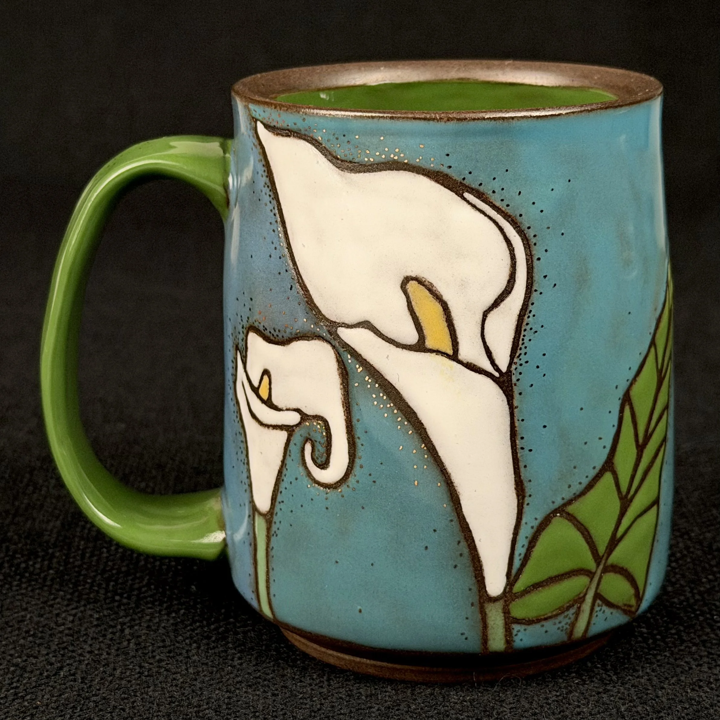 This mug was made on the potters wheel and then hand illustrated and painted. After being fired to full maturity, 22k gold was added and then it was fired to sinter it to the piece. Once the piece is removed from the final firing it is then sanded and cleaned.