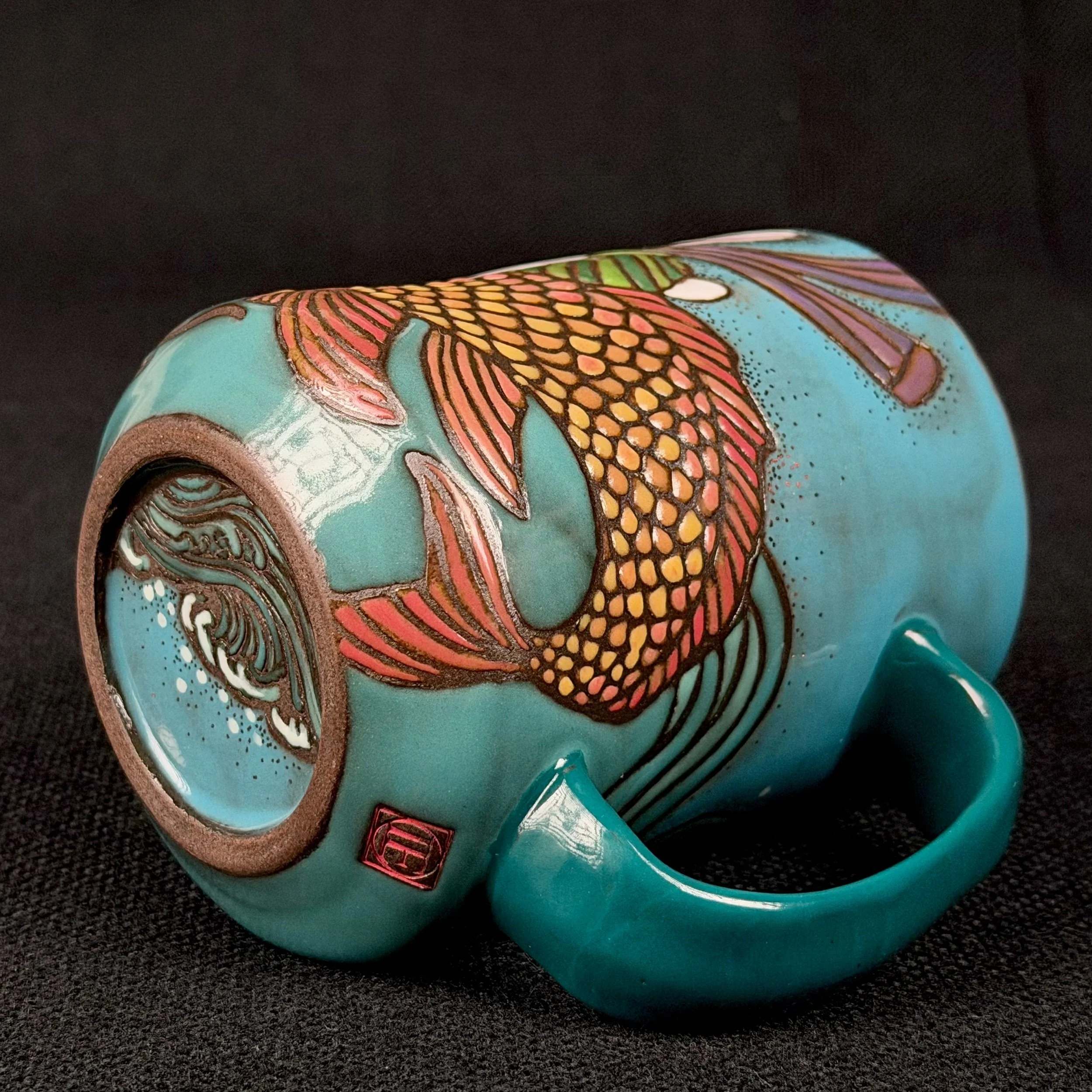 This mug was made on the potters wheel and then hand illustrated and painted. After being fired to full maturity, 22k gold was added and then it was fired to sinter it to the piece. Once the piece is removed from the final firing it is then sanded and cleaned.