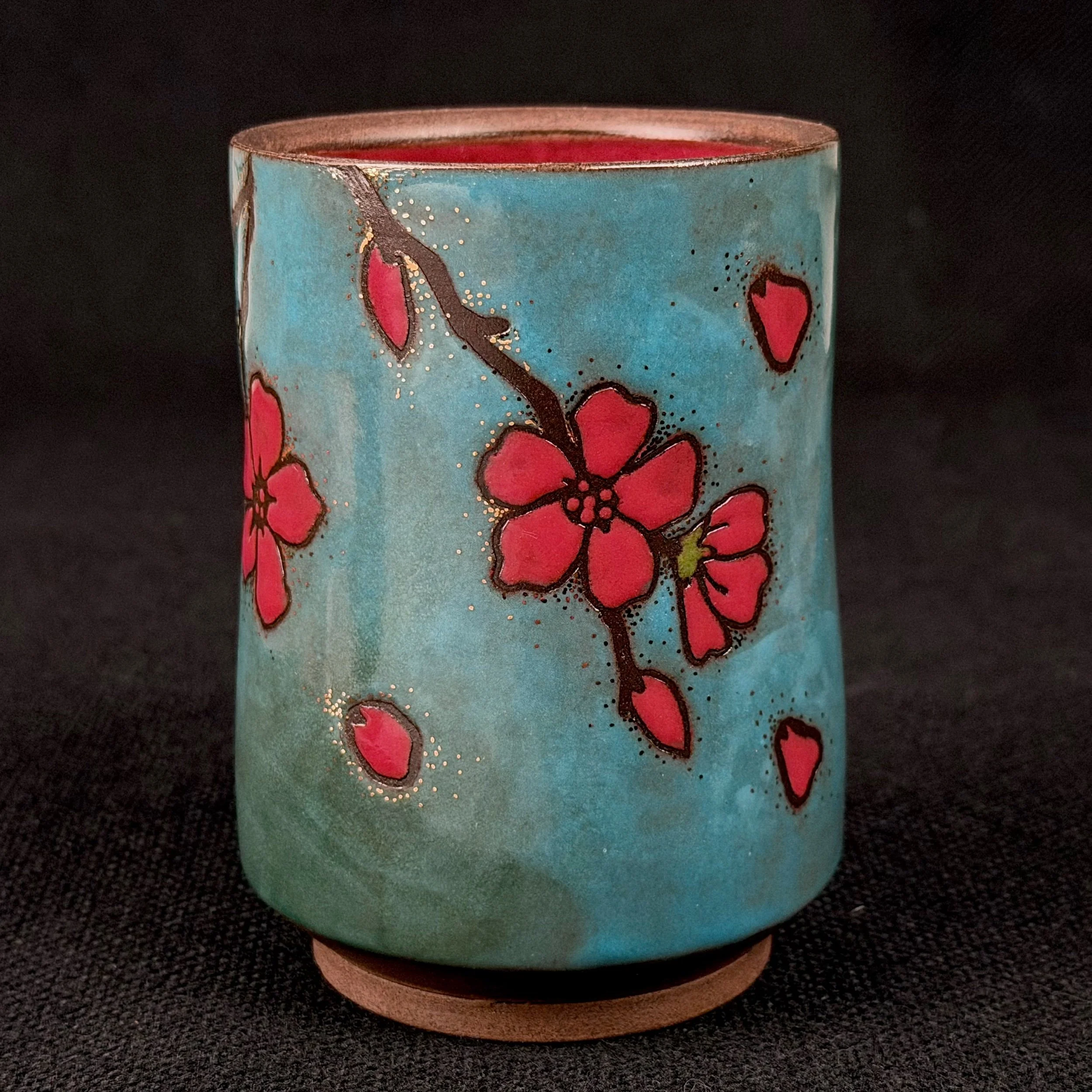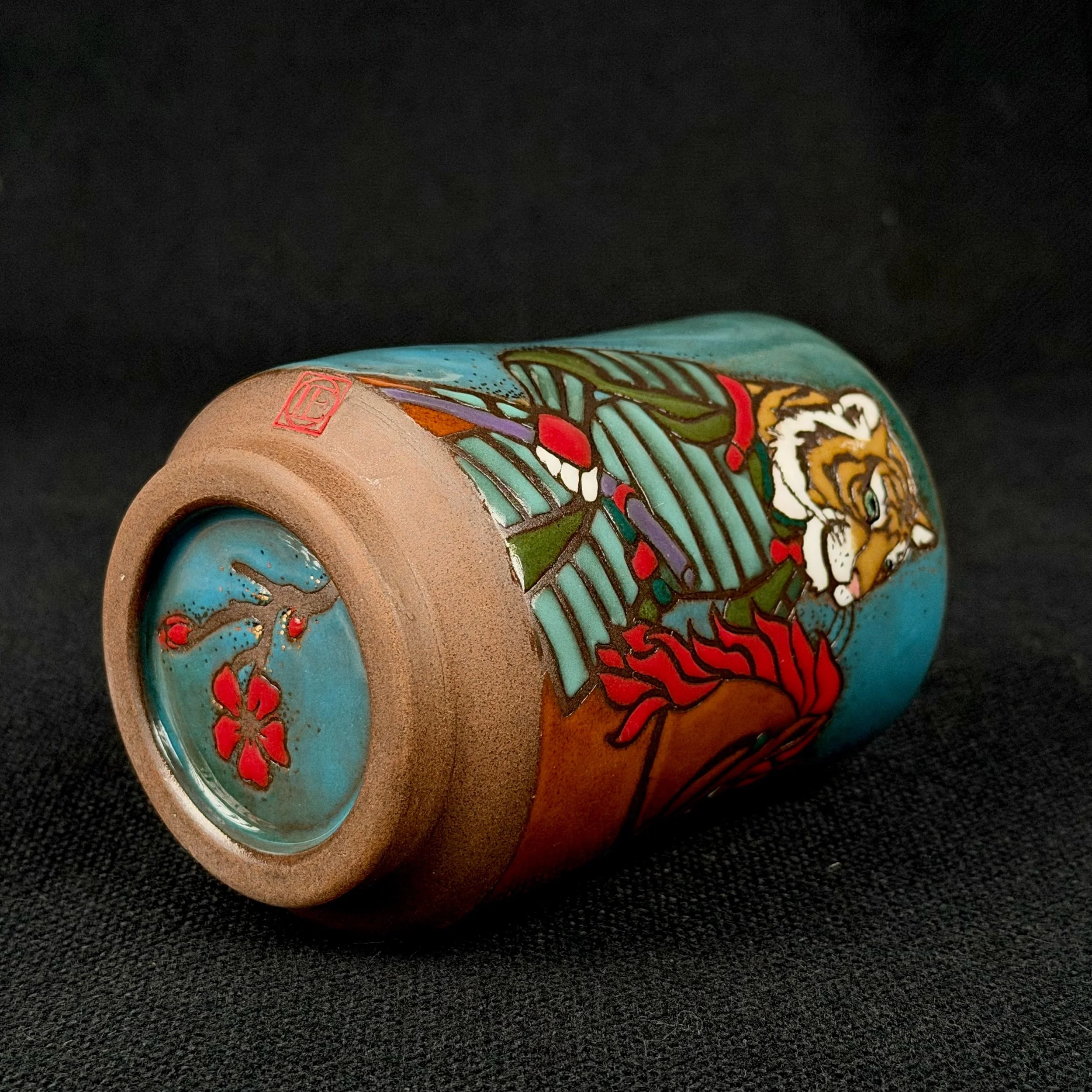 This mug was made on the potters wheel and then hand illustrated and painted. After being fired to full maturity, 22k gold was added and then it was fired to sinter it to the piece. Once the piece is removed from the final firing it is then sanded and cleaned.