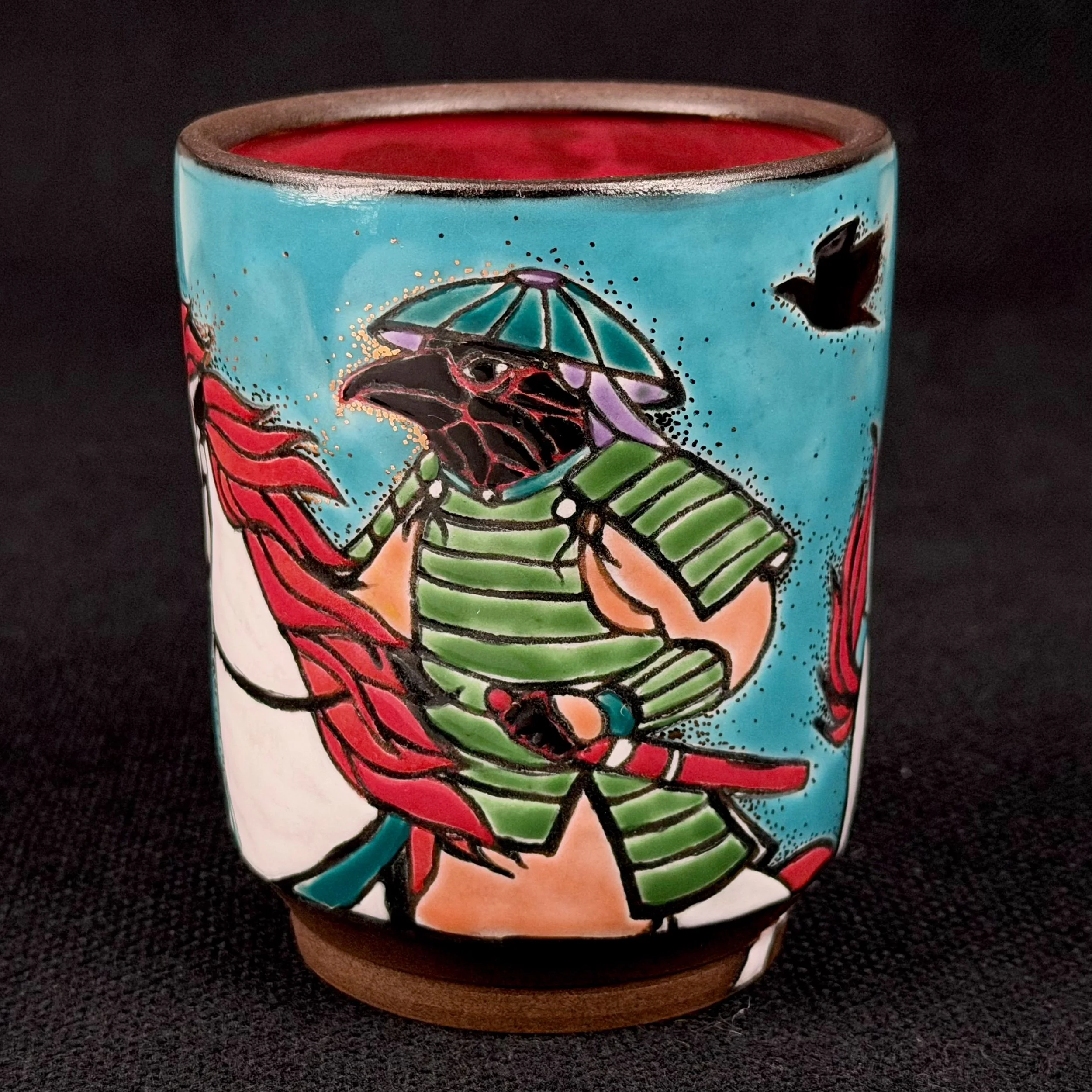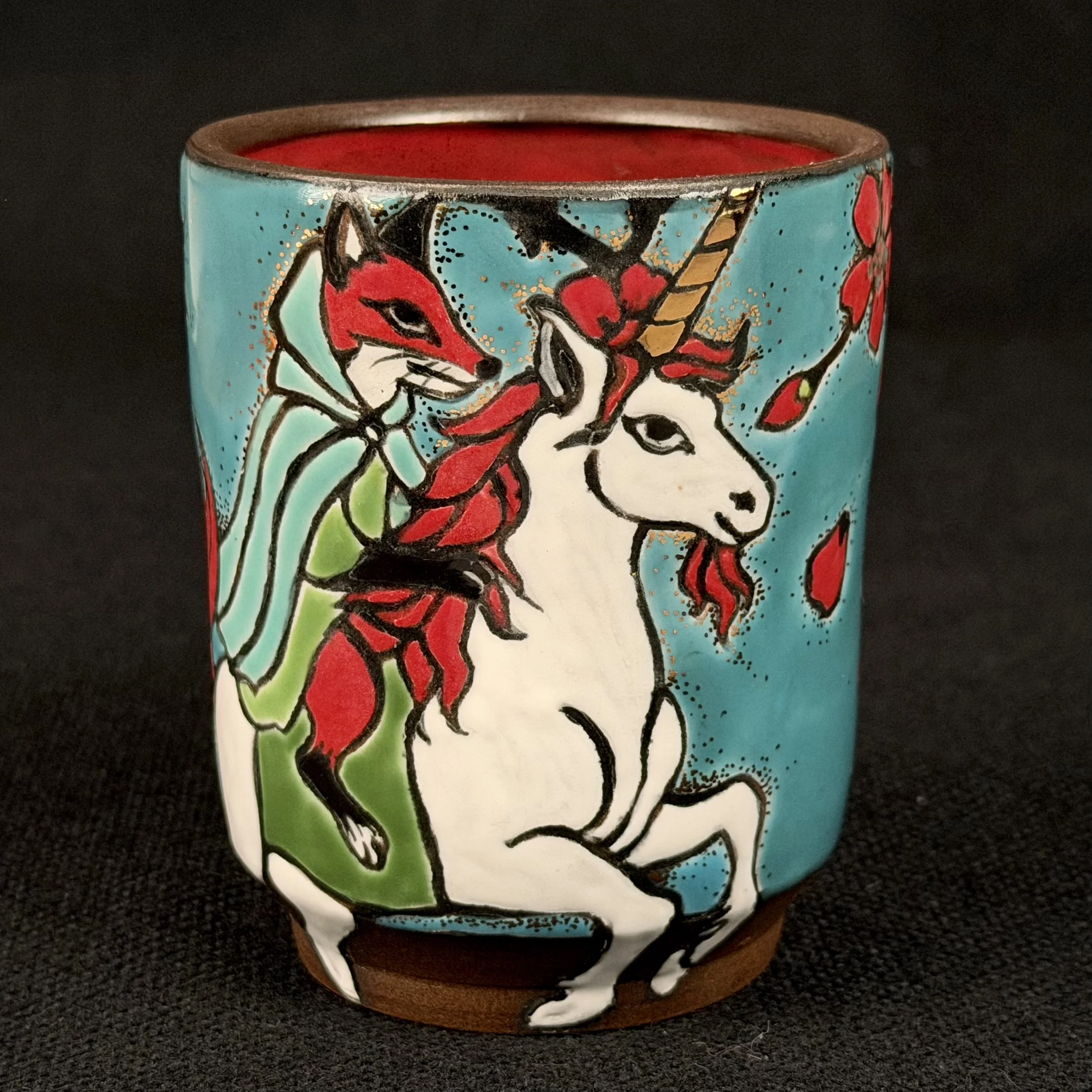 This mug was made on the potters wheel and then hand illustrated and painted. After being fired to full maturity, 22k gold was added and then it was fired to sinter it to the piece. Once the piece is removed from the final firing it is then sanded and cleaned.